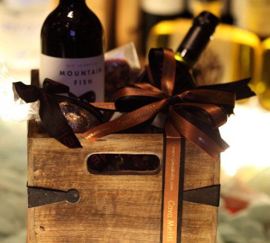 Χειροποίητο διακοσμητικό κουτί φτιαγμένο από ξύλο και μέταλλο ..περιέχει 2 φιάλες από το οινοποιείο στην Νεμέα .Το ένα κρασί είναι ερυθρό από την ποικιλία Αγιωργίτικο ενώ το δεύτερο κρασί είναι λευκό από την ποικιλία Μοσχοφίλερο – Επίσης ο παραλήπτης αυτού του Δώρου θα βρει ένα μεγάλο κομμάτι των 250 γραμ. χειροποίητης σοκολάτας αλλά και ένα σακουλάκι με 200γρ βέλγικες πραλίνες.